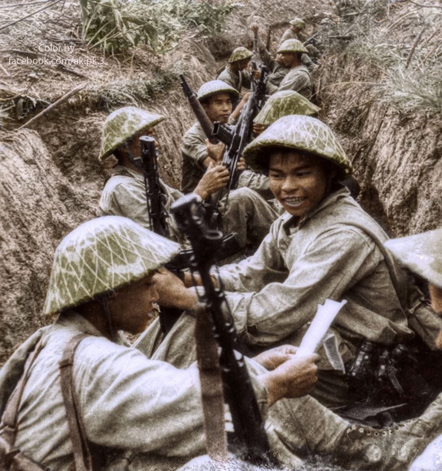 Бойцы Вьетминя в битве под Дьенбьенфу с пистолетами-пулеметами ППШ и французскими карабинами MAS-36.