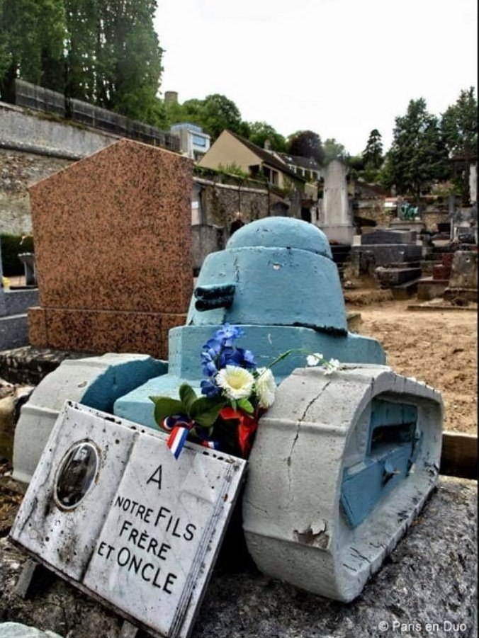 Необычный памятник в виде танка "Рено" FT-17 на могиле французского солдата Альберта Марселя, погибшего в июне 1940 года.