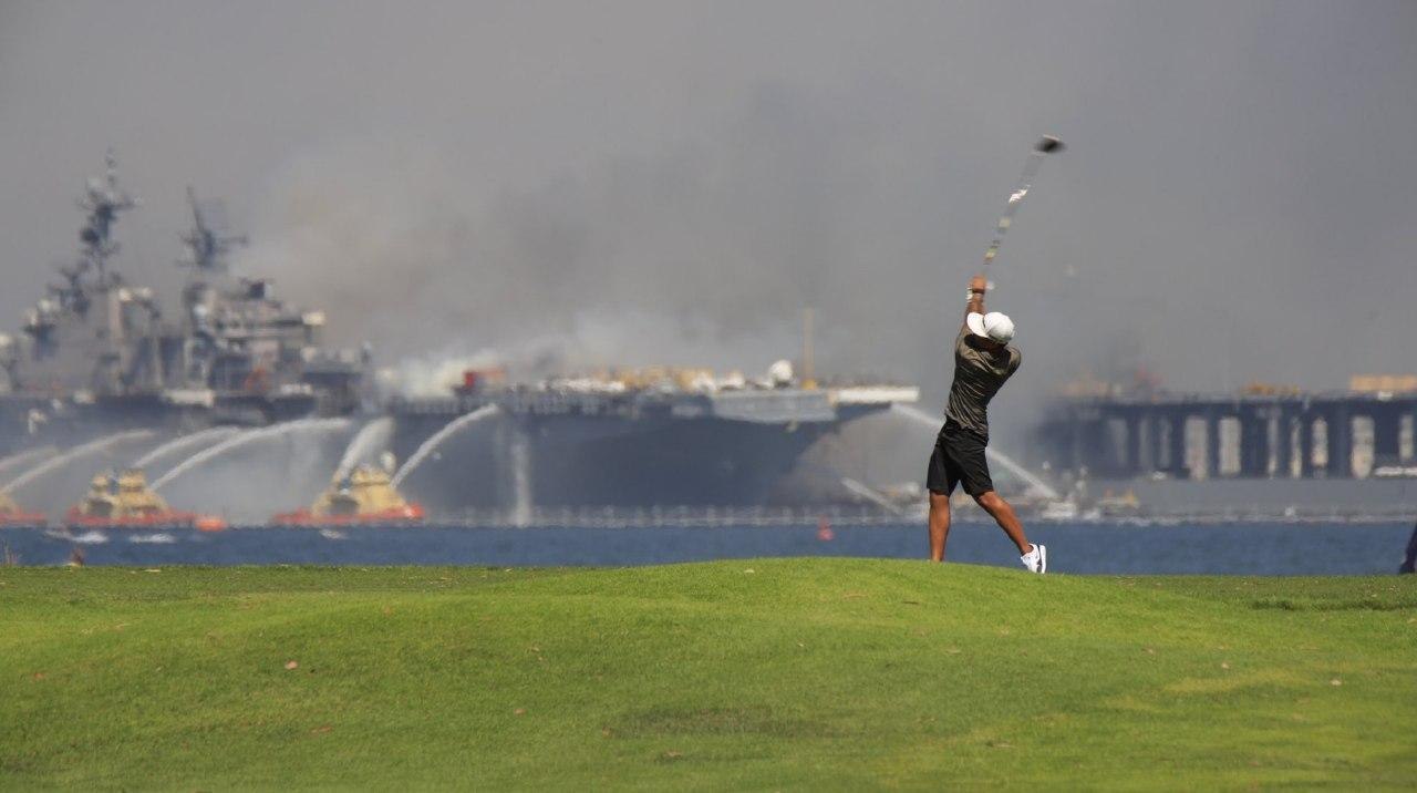 Пожар пожаром, а я эту лунку еще полгода назад бронировал! Гольфист в Санг-Диего на фоне горящего УДК Bonhomme Richard