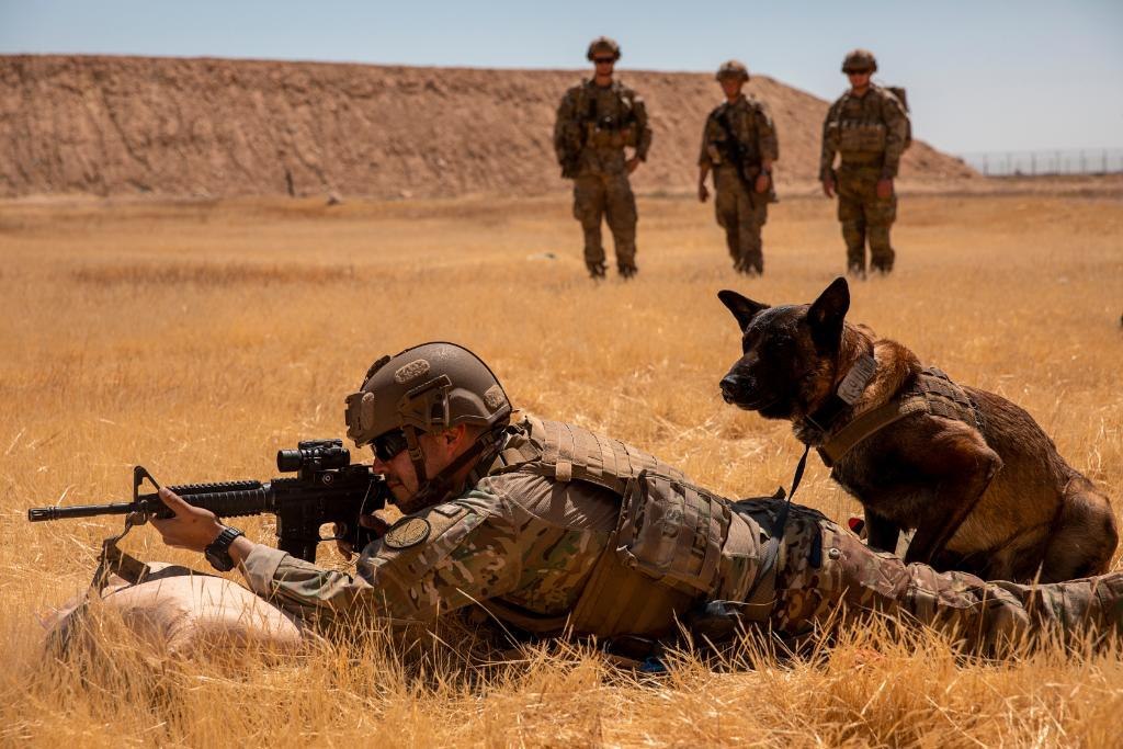 "Стреляй, Глеб Егорыч! Уйдёт!" Сержант на базе в Ираке ведёт огонь из М4 рядом со своей собакой. Одно из упражнений по построению командного взаимодействия между служебным псом и инструктором