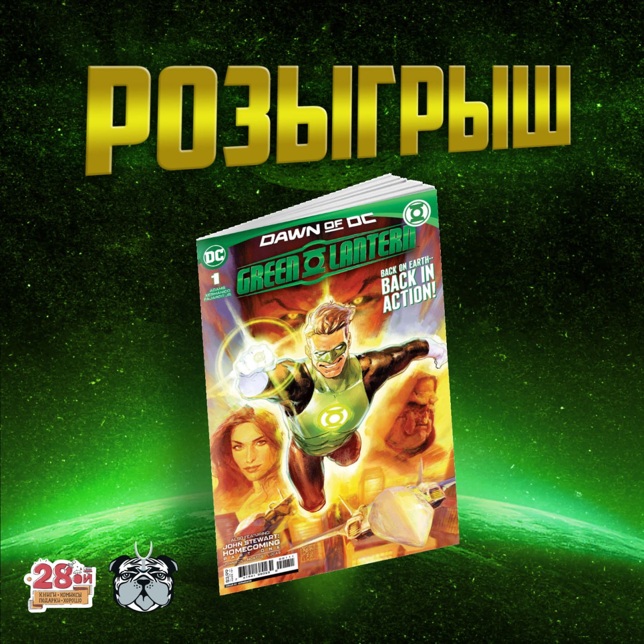 В этот раз мы разыграем старт нового онгоинга Зелёного Фонаря от Джереми Адамса, Xermanico и Ромуло Фахардо-младшего про «приземлённые» приключения Хэла Джордана. Впрочем, кавычки в этот раз немного лишние, потому что здесь он и правда оказался на Земле без возможности куда-либо улететь. В качестве бонуса — пролог к грядущей серии про Джона Стюарта от Филлипа Кеннеди Джонсона и Montos.