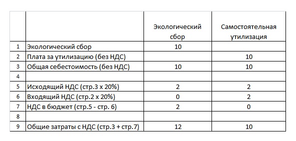 Что получается в итоге? В итоге получается, что при одинаковой стоимости утилизации, затраты при уплате экологического сбора будут выше на сумму НДС, начисляемую на размер экологического сбора по сравнению с самостоятельной утилизацией. НДС в большинстве случаев составляет 20%, не маленькая такая переплата.
