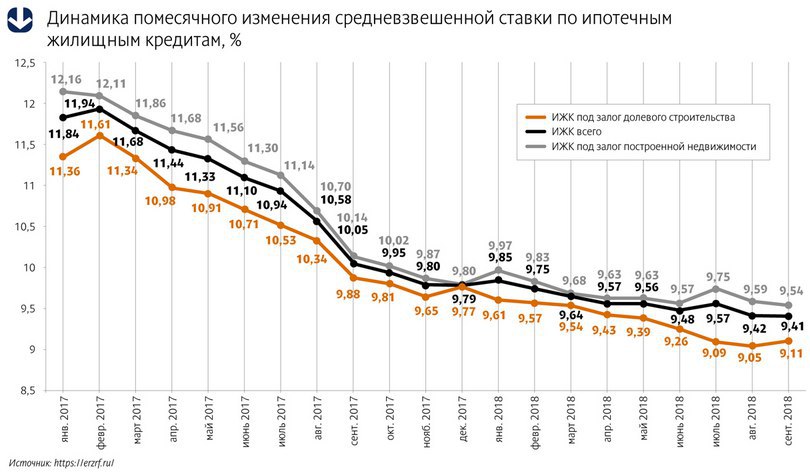 По данным Центробанка РФ, за январь–сентябрь 2018 года выдано более 1 млн кредитов, суммарно на 2,07 трлн рублей (+47,5% в количественном и +61,1% в денежном выражении к аналогичному периоду прошлого года). При этом средняя ставка по ипотеке за девять месяцев 2018 года составила 9,56% (–1,54 п. п. к аналогичному показателю прошлого года).