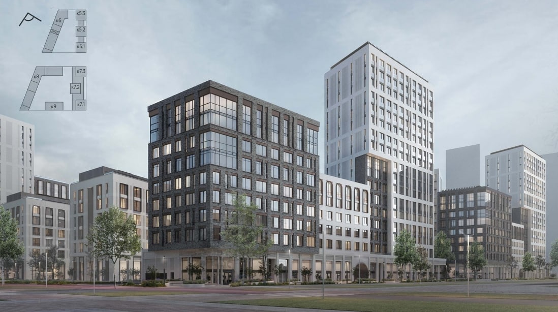Корпуса 5 и 6 будут образовывать единый комплекс с полузакрытым двором. Дома будут переменной этажности 1-6-9-12-17 этажей, а также подземный паркинг. На первых этажах предусмотрены магазины, кафе, ресторан, а также помещения общего назначения, где жильцы будут хранить велосипеды, коляски и другие вещи.