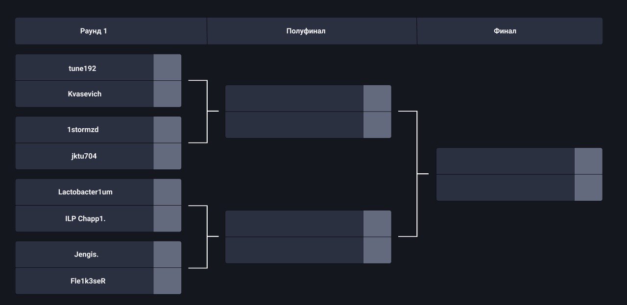 ❗Друзья, участники. Отыгрываем полуфинал и финал переносится на завтра. Из за подмены результатов, возникло много ошибок, участникам, кто пострадал будет компенсация! Просим прощение за заминки, формат новый, будем улучшать😉