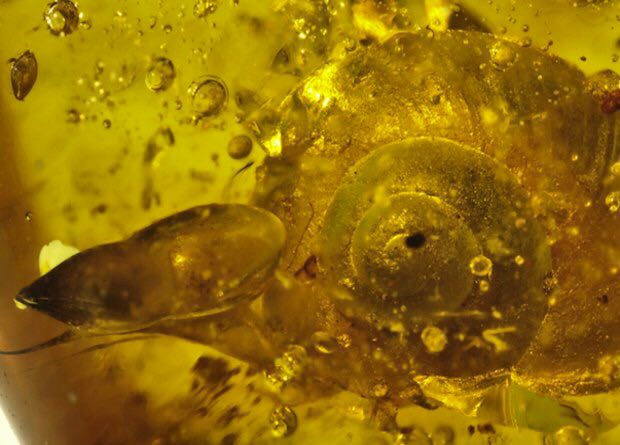 Ученые обнаружили улитку с хорошо сохранившимися мягкими тканями. Ее возраст — около 99 миллионов лет, а размер раковины — чуть меньше пяти миллиметров, из-за чего вид малыша определить сложно. Кроме того, ученые считают, что улитка попала в янтарь живой и пыталась сбежать: об этом говорит вытянутое тело.