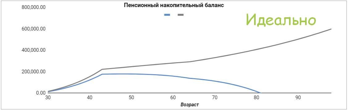 Плохой результат. Серая линия, пересекающая ось возраста раньше синей, означает, что ваших накоплений не хватит, чтобы обеспечить вас до конца дней. В этом случае нужно поиграться с цифрами. Либо увеличить срок накопления денег, либо увеличить процент откладываемых денег. Даже незначительные изменения в цифрах могут в корне поменять график.