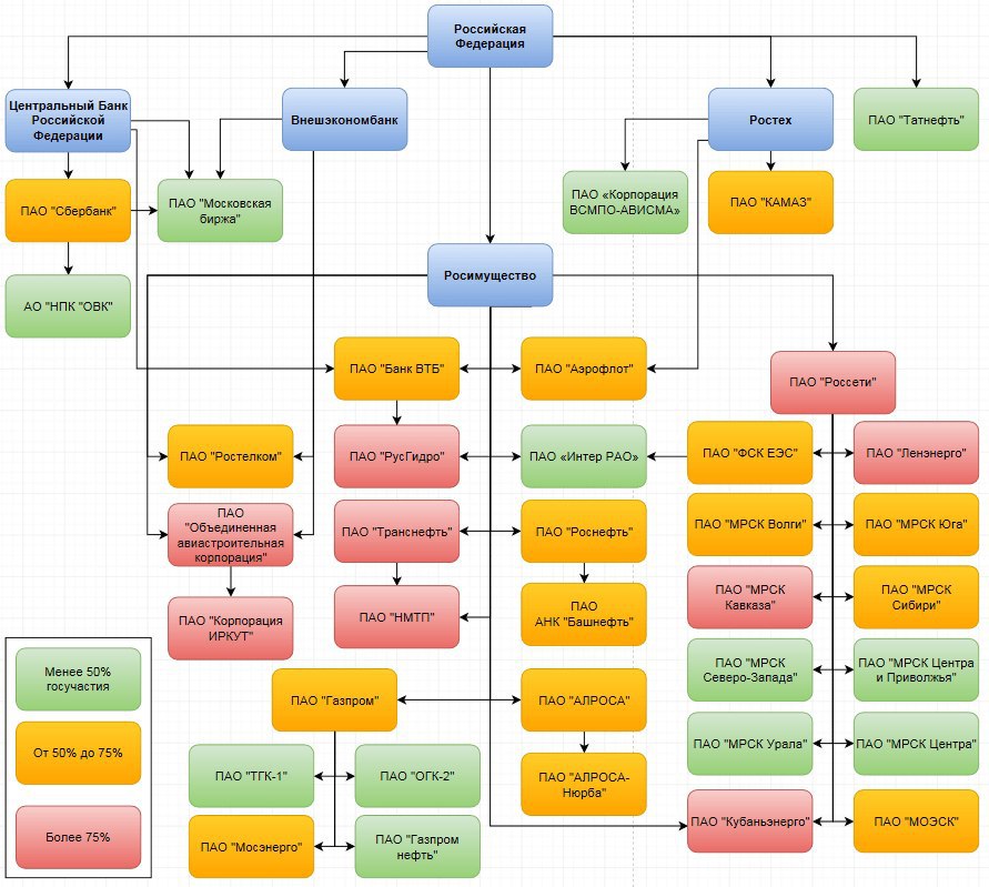 Так как государство главный акционер, то все важные решения в первую очередь будут приниматься с учетом интересов государства. Наши интересы, как частных инвесторов, будут на последнем месте. Политические риски и риск наложения санкций останавливают меня от инвестирования в акции российских компаний. В конце поста я прикрепил наглядную картинку с указанием долей государственного участия в российских компаниях.