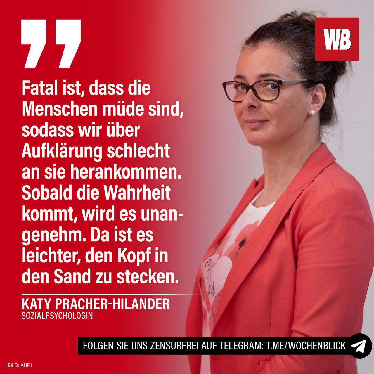Sie lässt sich nicht mehr zensieren und bringt ihre Berichte künftig auf dem neuen Sender AUF1 in ihrem eigenen Format „AUFrecht“ sowie auf Telegram.