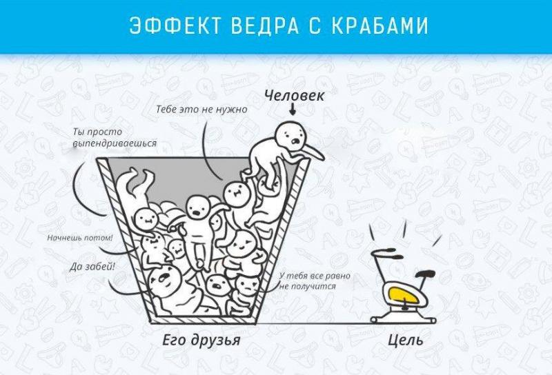 По одиночке каждый из них легко может выбраться из ведра. Но когда их много, и один из них пытается вылезти, остальные цепляются за него и затягивают обратно.