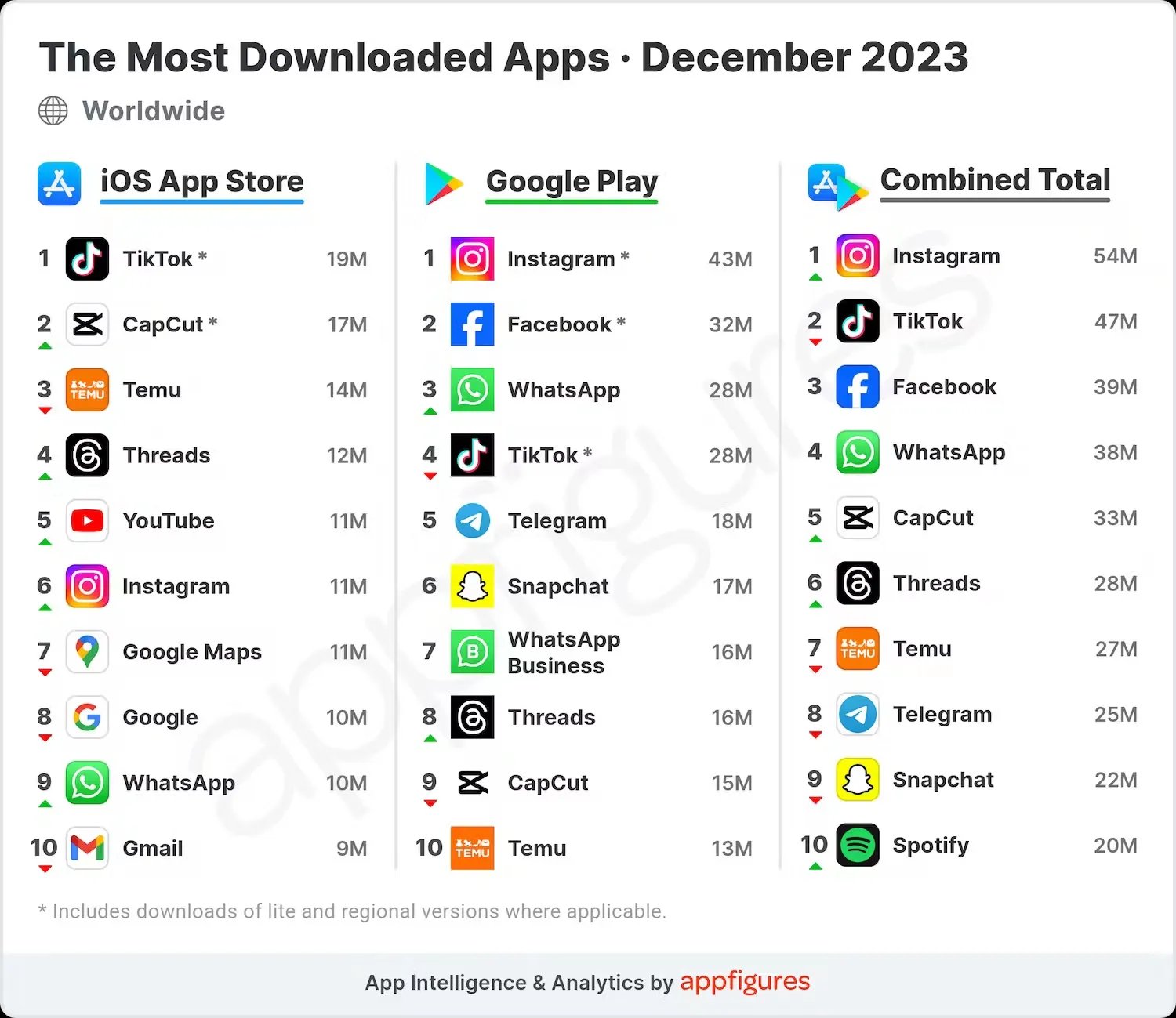 Для порівняння, X (Twitter) навіть не увійшов у Топ-30. Він набрав лише 9 мільйонів завантажень, посівши 36 місце в загальному рейтингу.