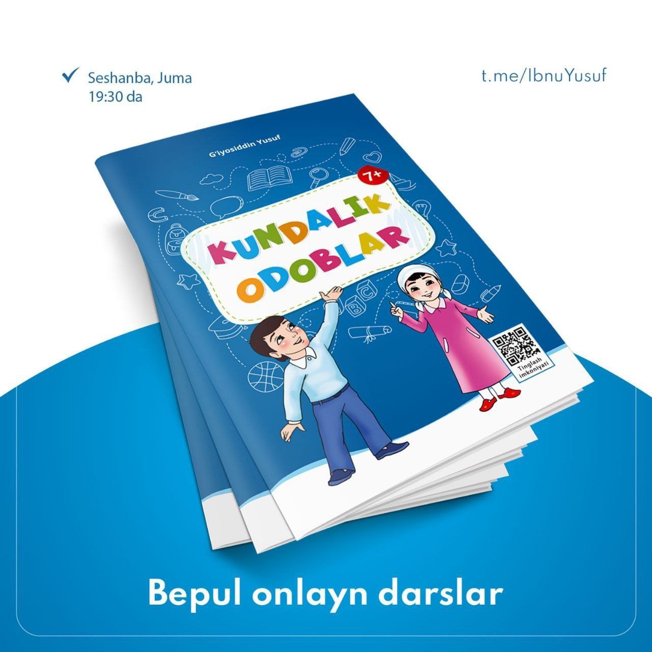 Telegramdagi @IbnuYusuf kanalida "Kundalik odoblar" kitobidan bepul onlayn darslar olib borilmoqda. O‘quvchilar soni cheklanmagan. Ishtirok etish uchun ovozli chatga qo‘shilish kifoya.