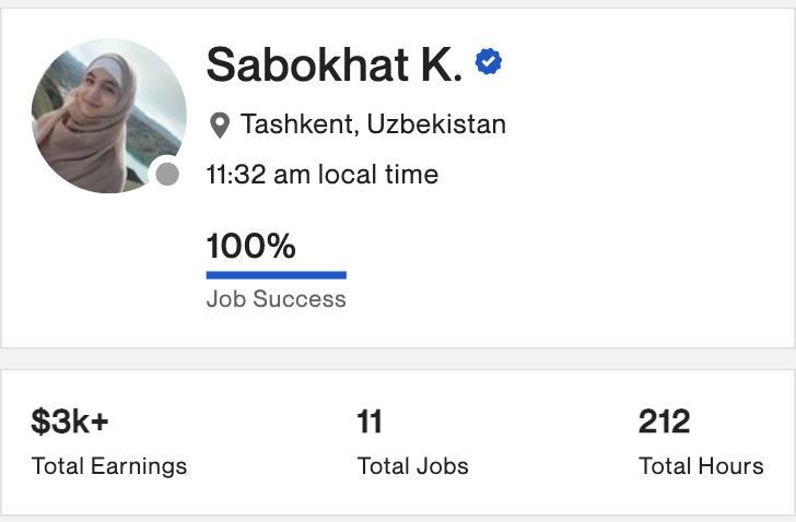 Tanishing: Sabohat. Ayni paytda Upwork orqali 3000$ dan oshiq daromad qilgan Fullstack dasturchi. 11 ta ish va 100% Job success.