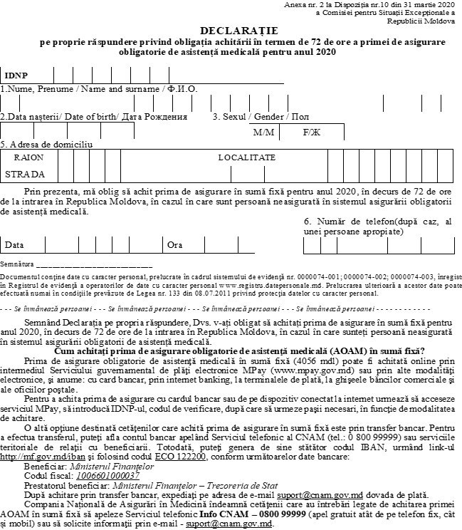 🚗 Dacă cetățeanul moldovean va dori să revină pe cale terestră, atunci va fi obligat să completeze formularul de mai jos, prin care se obligă să achite polița de asigurare în termen de 72 de ore de la intrare.