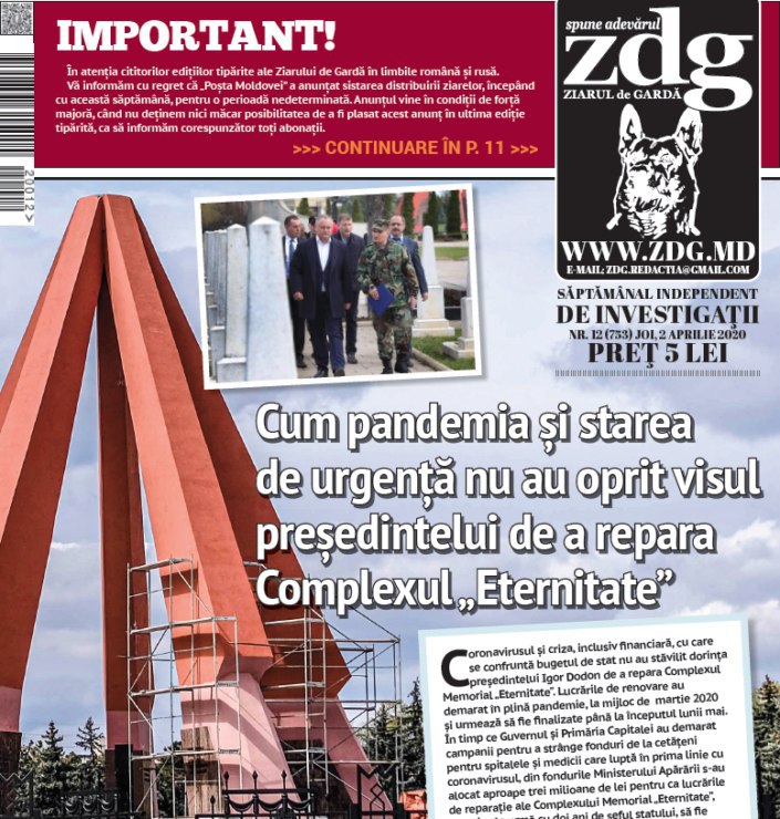 ❗️Bună Dimineața! Astăzi, din păcate, Ziarul de Gardă nu a ieșit din tipare. Asta pentru că Poșta Moldovei a anunțat că suspendă pe un termen nelimitat distribuția ziarelor pe teritoriul Republicii Moldova. Ne cerem scuze, dar e o situație ce nu ține de noi.