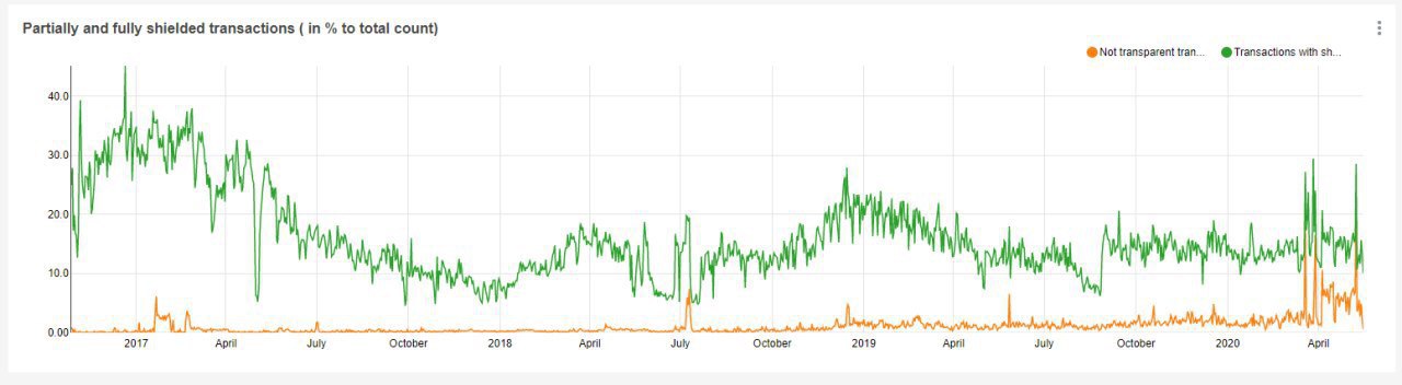 ​​Объем экранированных и обычных транзакций в сети Zcash.