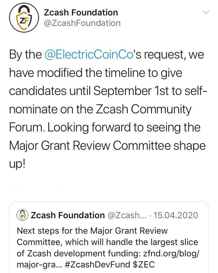 По просьбе ECC изменили график, чтобы предоставить кандидатам до 1 сентября возможность самовыдвижения на форуме сообщества Zcash. Фонд Zcash с нетерпением ждет, когда будет сформирован Главный комитет по рассмотрению грантов.