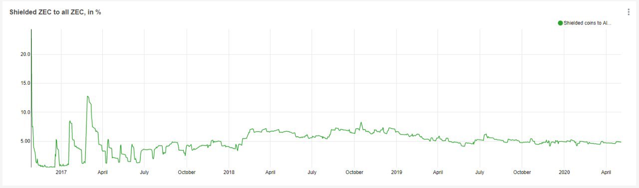 ​​Экранированные транзакции в ZEC по отношению ко всем транзакциям в %: