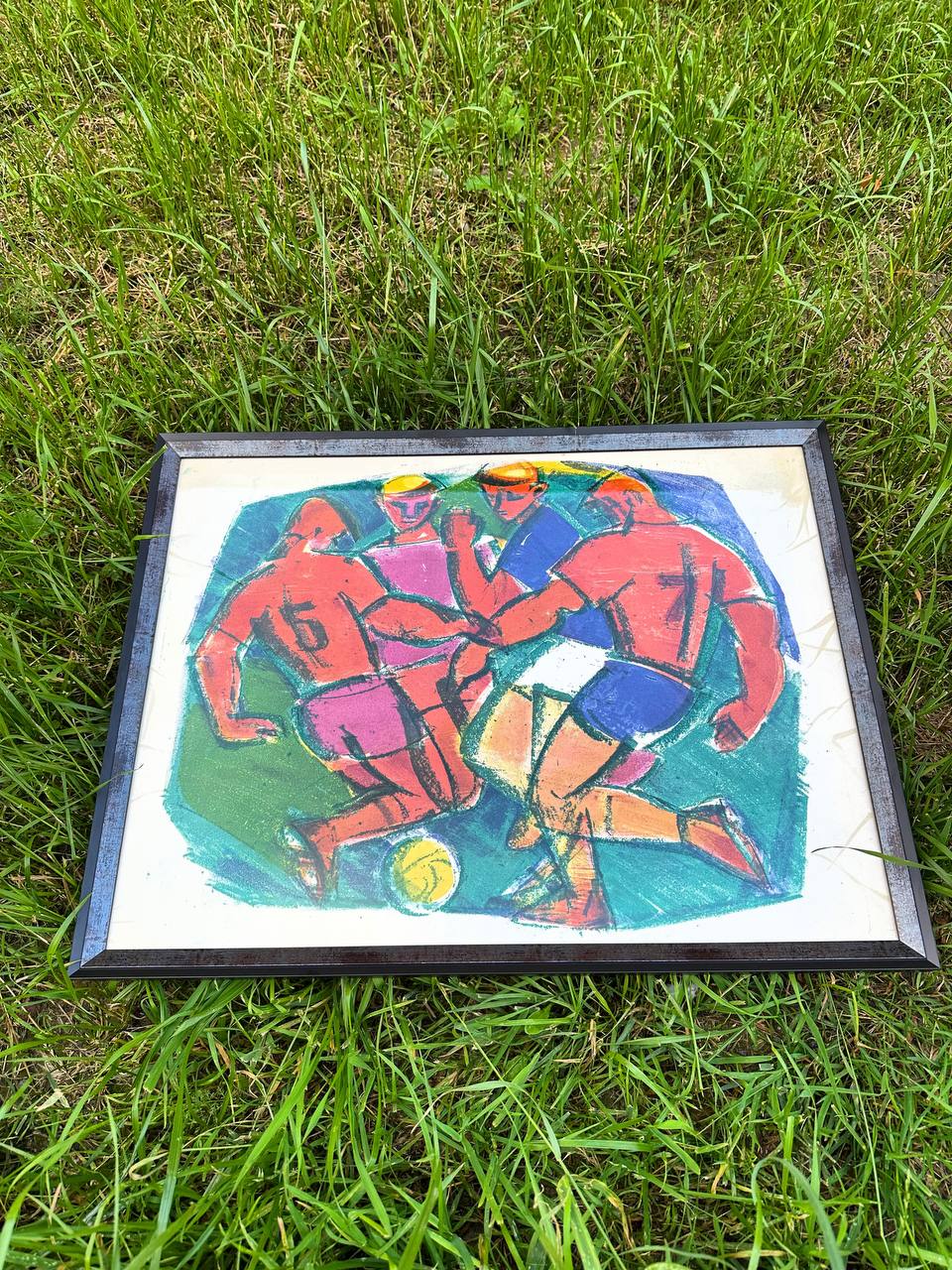 Это литография, которую Вера Федоровна создала в 1969 году в рамках своего футбольного цикла. Спортсмены изображены симметрично, линии четкие и резкие, что создает атмосферу динамичного футбольного поединка. Чувствуется дань традиции русского авангарда за счет геометричности изображения игроков, части тел которых напоминают фрагменты геометрических фигур.