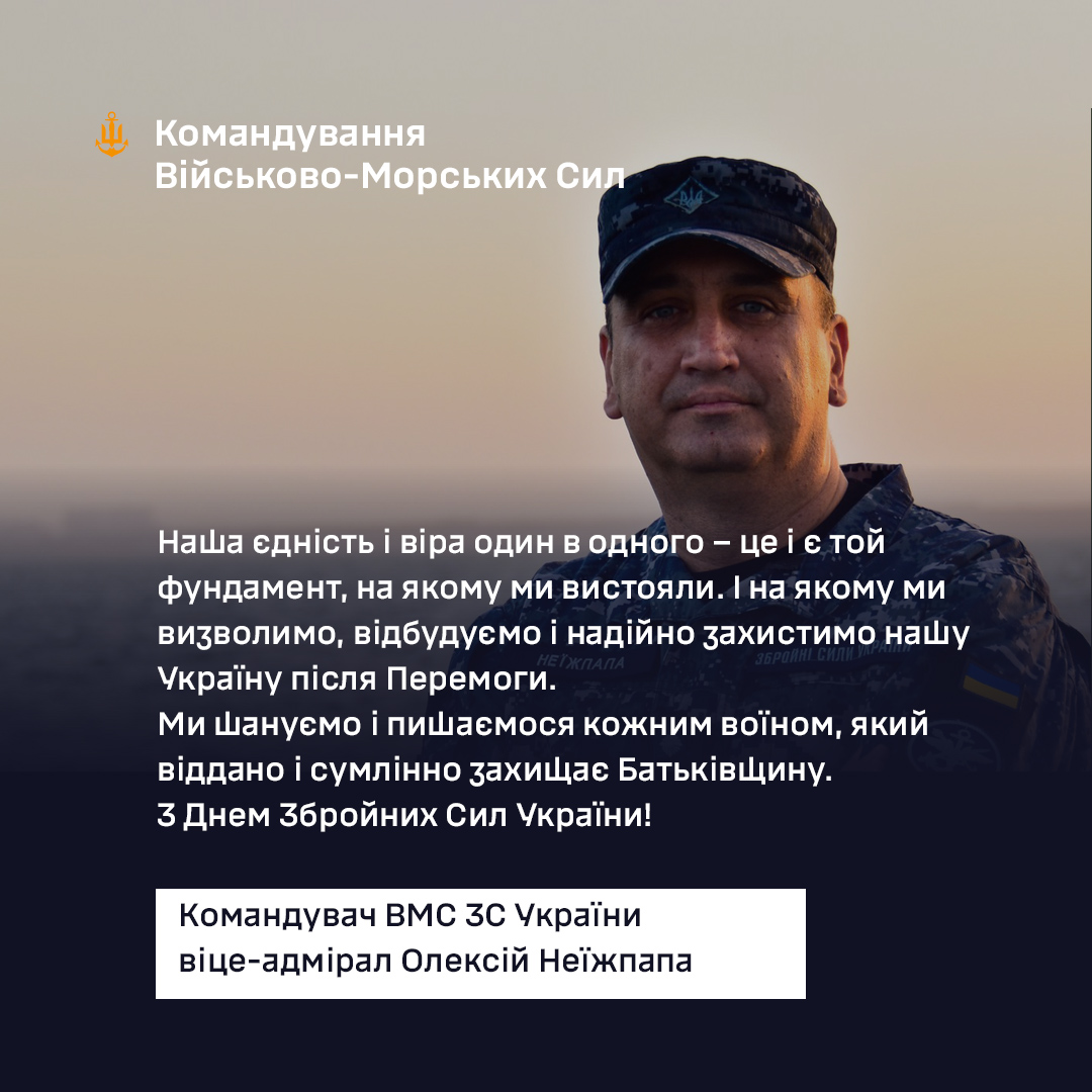 Шановні захисники та захисниці, офіцери, старшини та матроси, члени сімей військовослужбовців, від імені Командування Військово-Морських Сил ЗС України та себе особисто вітаю вас з Днем Збройних Сил України!